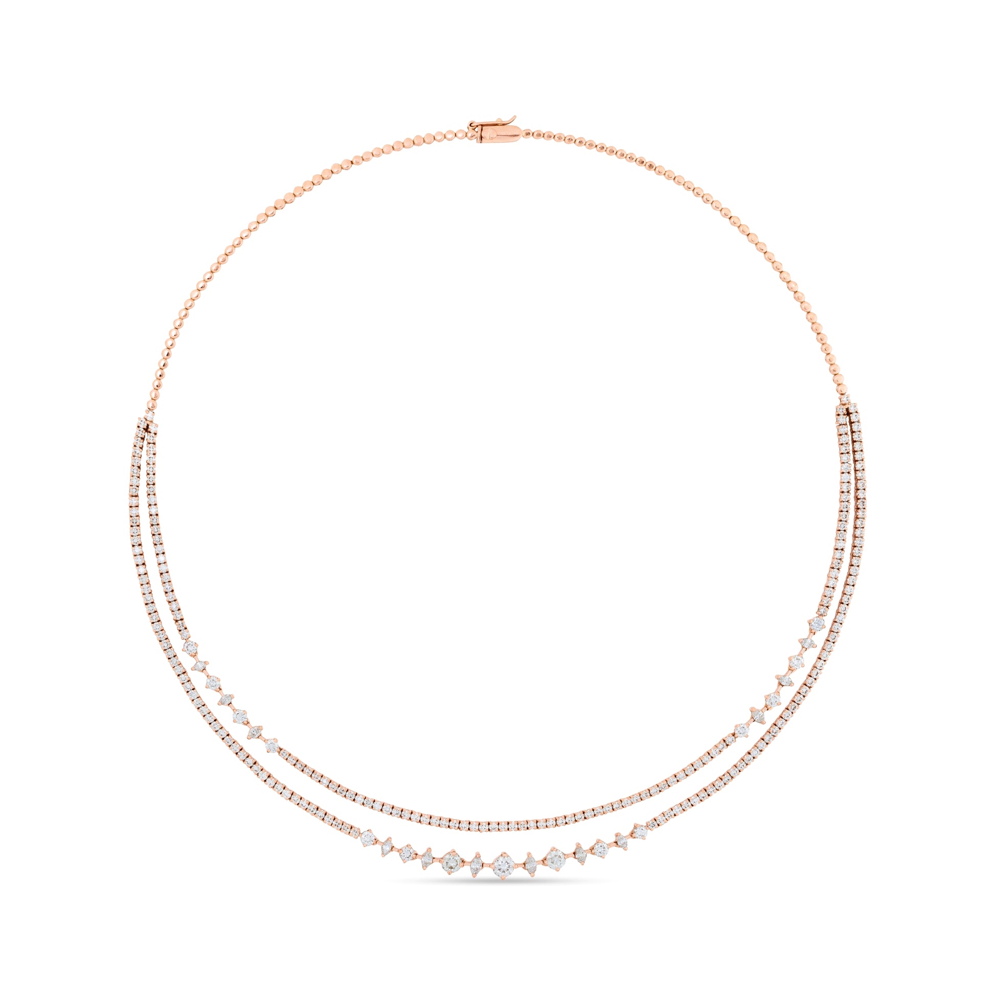 The Golden Grace Marquise Round Stellare Gold Necklace embodies elegance and radiant sophistication. Featuring a harmonious combination of marquise and round-cut stones set in polished gold, it captures light from every angle, creating a luminous, eye-catching display. Designed to drape gracefully around the neckline, this necklace blends classic refinement with contemporary artistry.