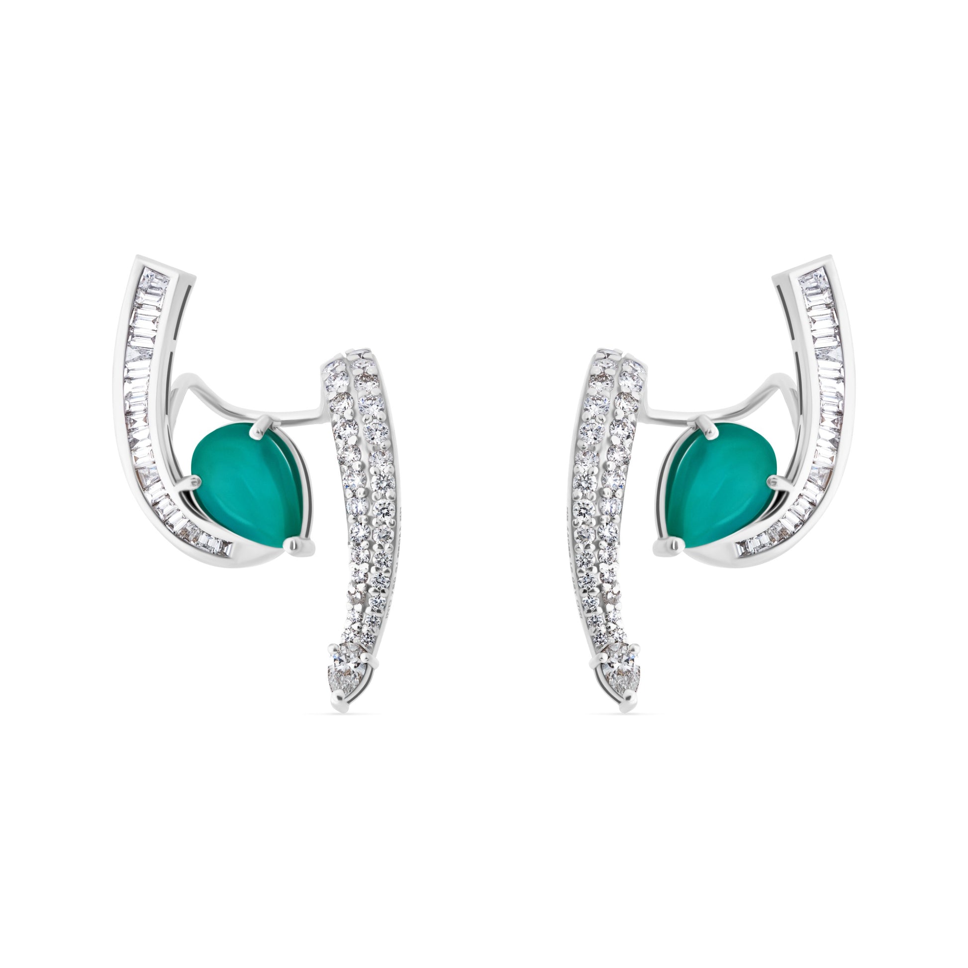 The Emerald Green Fancy Cecely White Gold Earrings radiate elegance and vibrant sophistication. Featuring dazzling emerald-green gemstones as the centerpiece, delicately accented with sparkling stones, each earring captures light beautifully from every angle. Crafted in polished white gold, the design combines a refined silhouette with modern charm, perfect for both special occasions and everyday luxury.